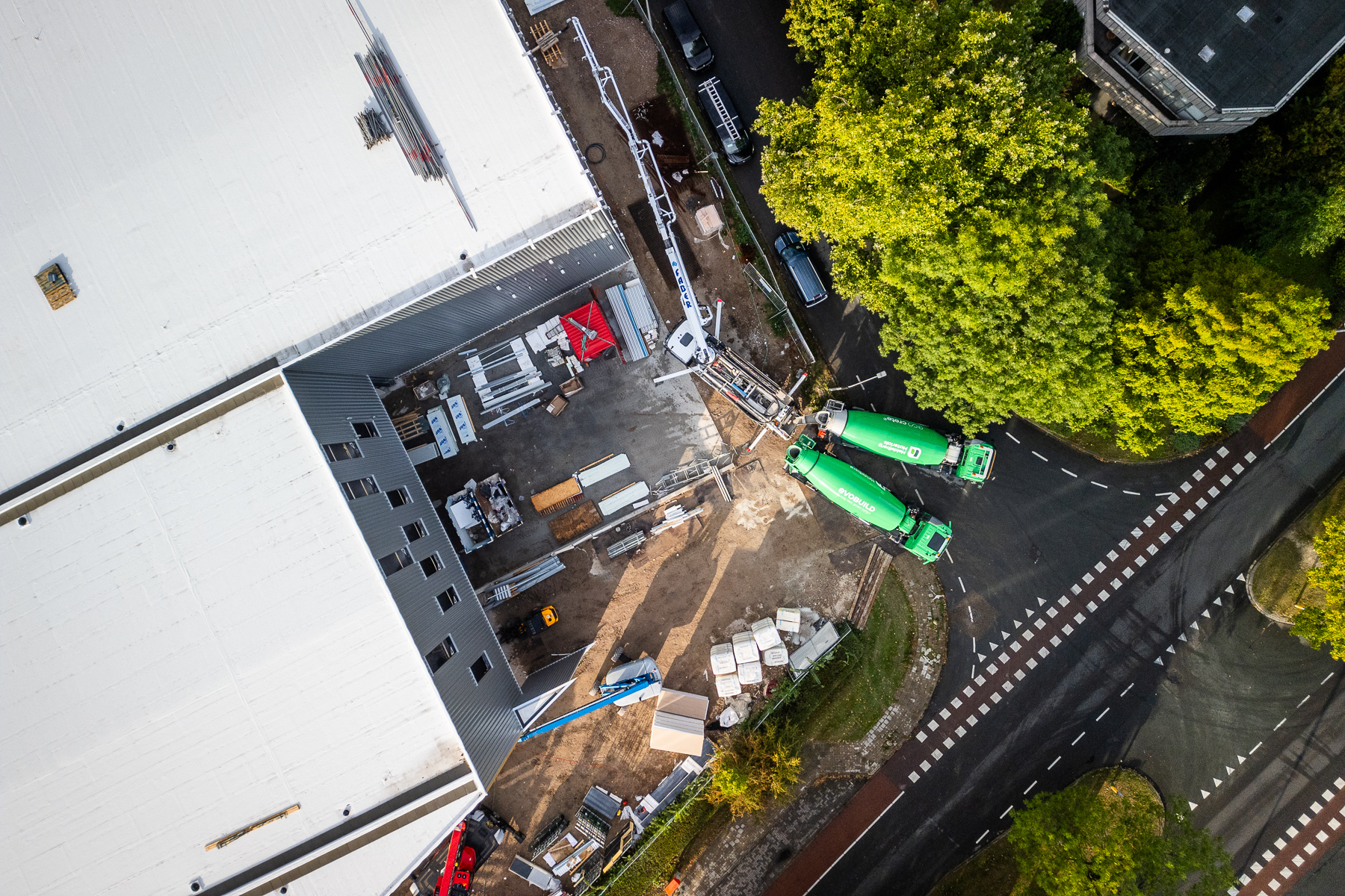Op het moment van filmen werd de 700m³ staalvezel betonvloer klasse 3 gestort door Vloertechniek B.V. Na een periode van uitharden, kunnen we verder met de volgende werkzaamheden, waaronder de plaatsing van de lift en vluchttrap.